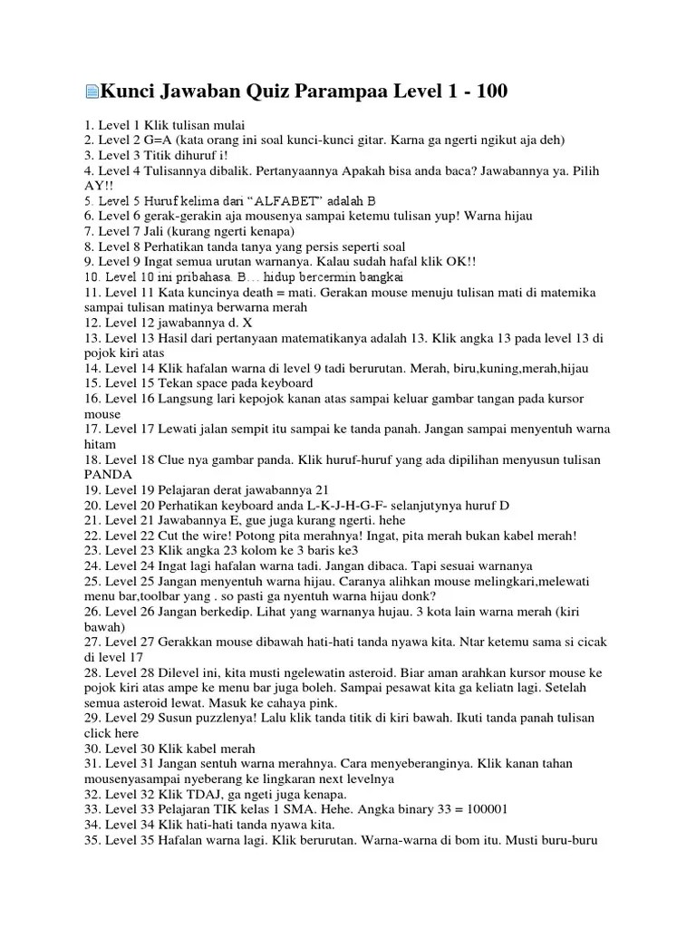 kunci jawaban quiz parampaa level 1 100 1. I like quiz parampaa and ghost rider 1 2. Klik i pada tulisan indonesia.level 108. Tahan kiri biar gk game overlevel 102 : Klik kata mulai yang mana aja terserah. Pilih lingkaran di atas huruf "i". Bagikan di facebook bagikan di. Ada cara lain, lelet level 32 : level 41 klik titik ditanda seru. Klik kata mulai, yang mana aja terserah. Contoh kunci jawaban revisi parampaa. Main parampaa 2 password level 123 : Ditulis ryto 11/08/2018 0 komentar.